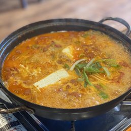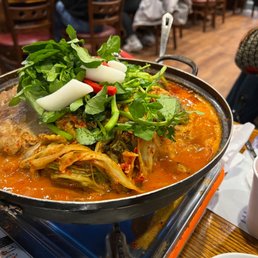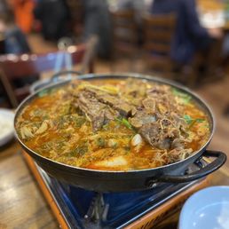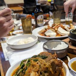 Warm, cozy, and large platters of korean comfort food. Perfect on a cold winter night. Ordered a giant pork bone stew for 3 plus 2 sides orders (pork kimchi stir fry, and potato pancake) and it was more than enough to feed a table of 5. Homey vibes with staff that serve and cater to you attentively. + points as they give us aprons to borrow to protect our clothes from splatter! Kind souls who know that while I wear light grey, light grey is not impervious to spicy korean stew soup stains. Not once did we feel rushed and the food was great! Will be back again!